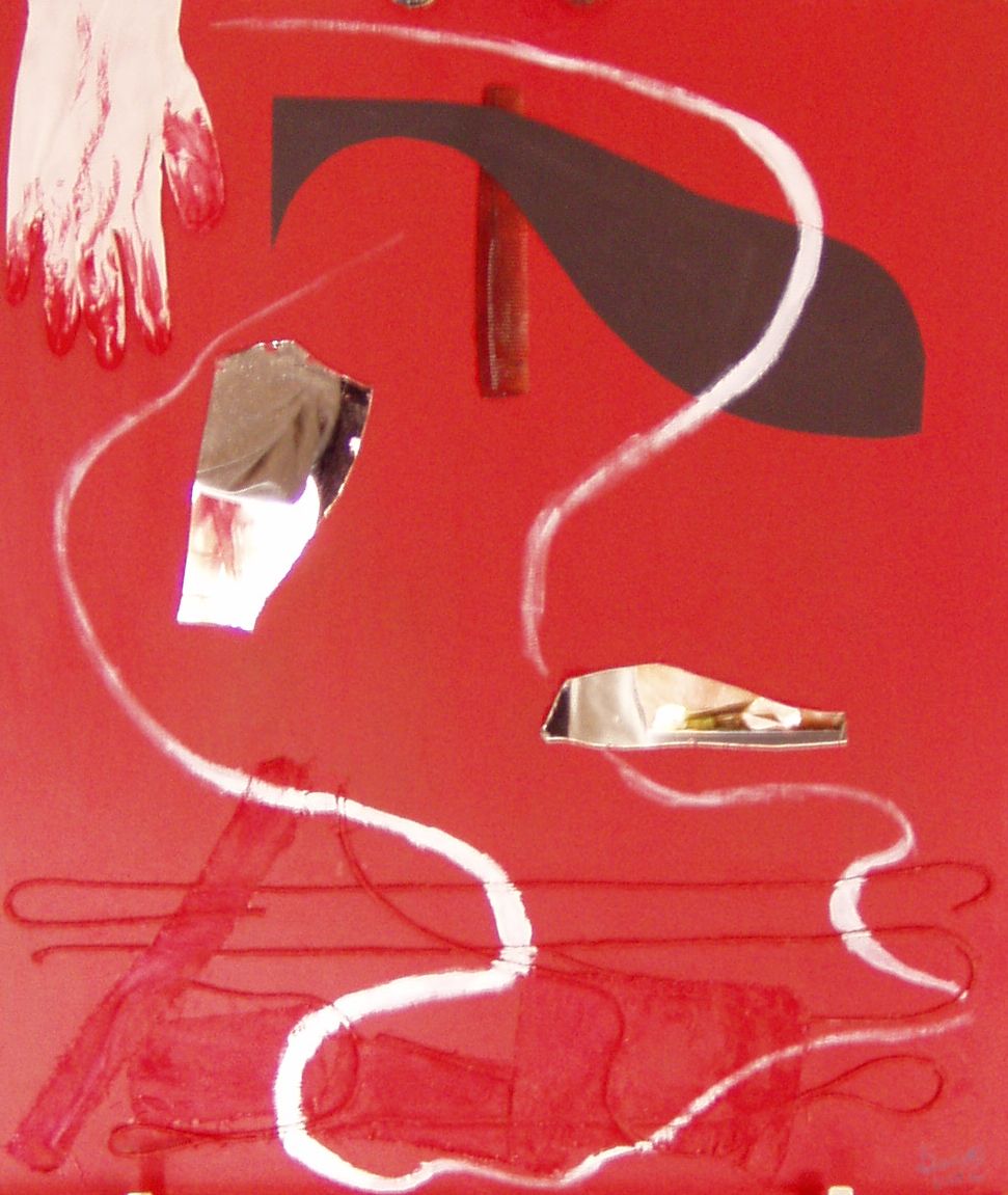 acrilico, frammenti di specchio, guanto, pettine, cartoncino nero, spago, stracci