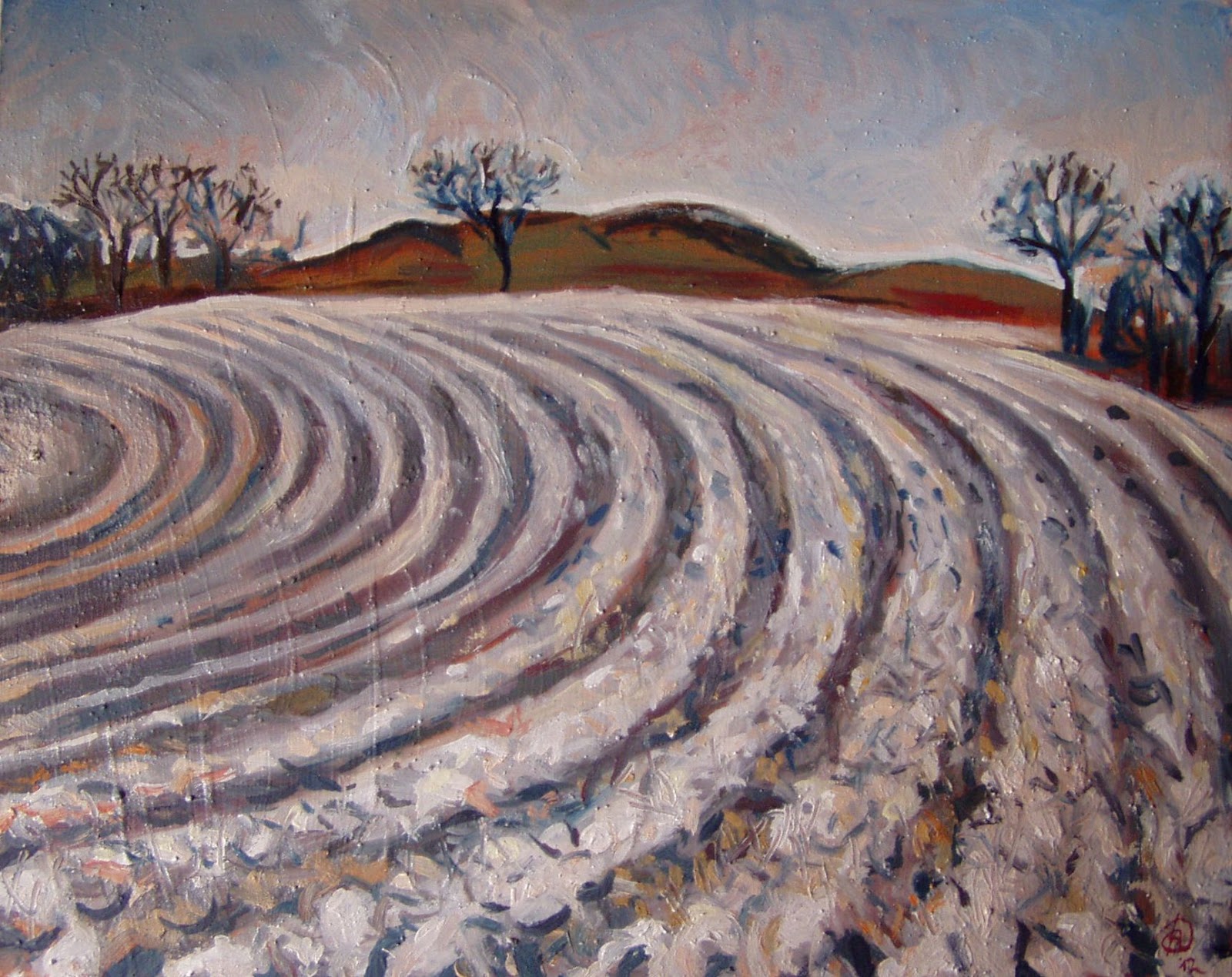 Ondulazioni affascinanti, riportano a un movimento che è anche interiore, e soprattutto è bello quel chiarore, laggiù dietro le colline, che sale con lievi tratti di spatola rosa nel giallo azzurrino dell'alba, verso la cima del cielo.