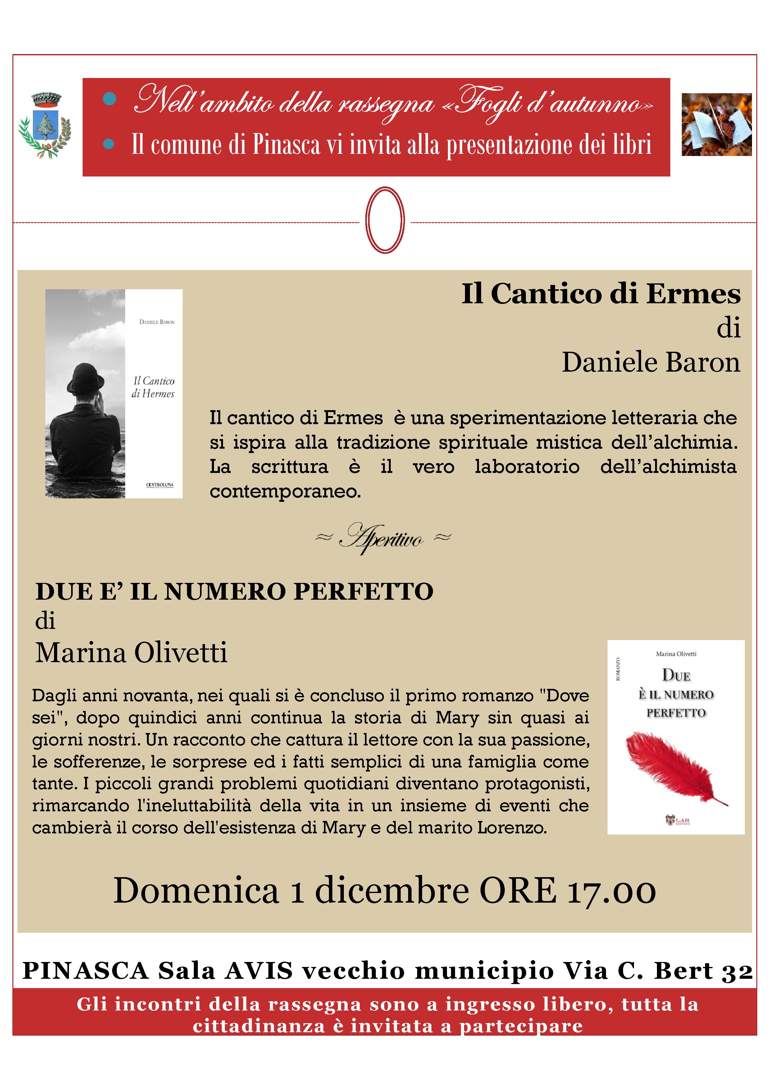 Nell’ambito della Rassegna Fogli d’Autunno, grazie all’ospitalità dell’Amministrazione del Comune di Pinasca e in particolare dell’Assessore alla Cultura Dr.ssa Rossana Todesco, ho il piacere di presentare il Cantico di Hermes nella Sala AVIS Vecchio Municipio Via C.Bert 32. Seguirà aperitivo e presentazione del romanzo di Marina Olivetti.