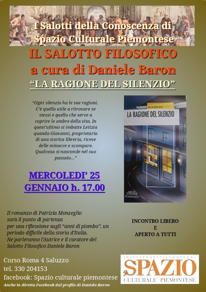 Il prossimo mercoledì 25 gennaio a Saluzzo presso lo Spazio Culturale Piemontese via Roma n. 4 alle ore 17 ci sarà un nuovo appuntamento del Salotto della Filosofia da me curato.