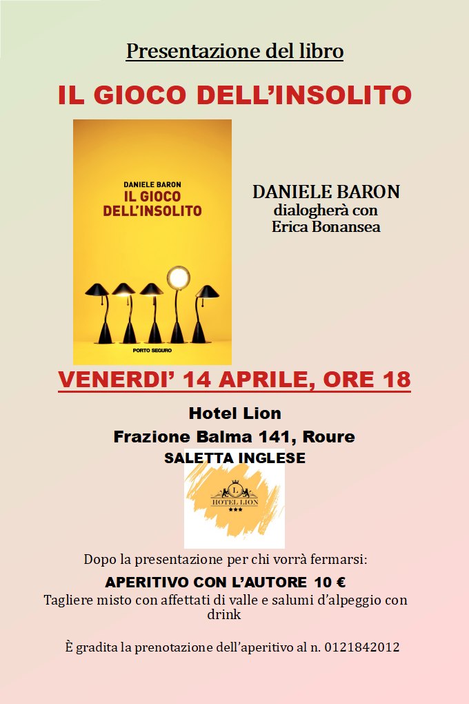 Prima presentazione al pubblico della mia ultima opera Il gioco dell’insolito una raccolta di otto racconti, venerdì 14 aprile alle ore 18.00 presso l’Hotel Lion a Roure.