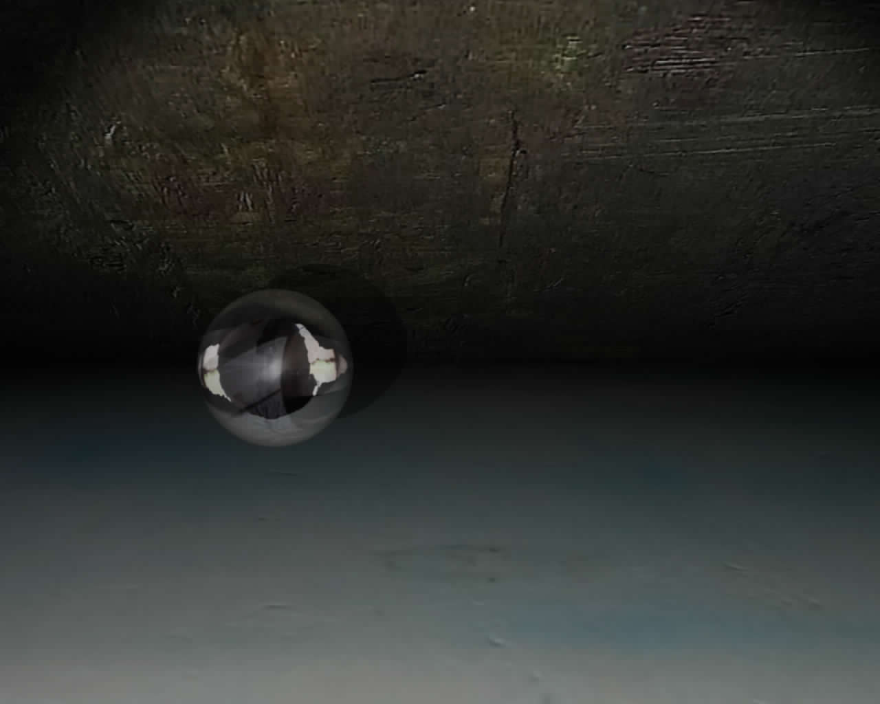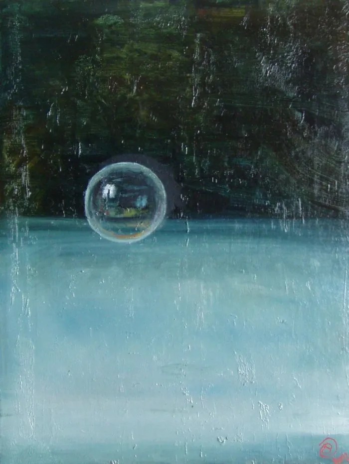 Ci sono poi alcune “presenze” nascoste. Guardate il riflesso della luce sulla bolla: si può scorgere quella che potrebbe essere la sagoma di una persona in controluce. Osservate poi meglio il fondo: non è piano, la superficie è piena di venature, di striature. Tutto questo dà movimento e anima l’opera. Il segreto per questo secondo elemento? La tela non era vergine: avevo dipinto sopra un mio precedente quadro coperto.