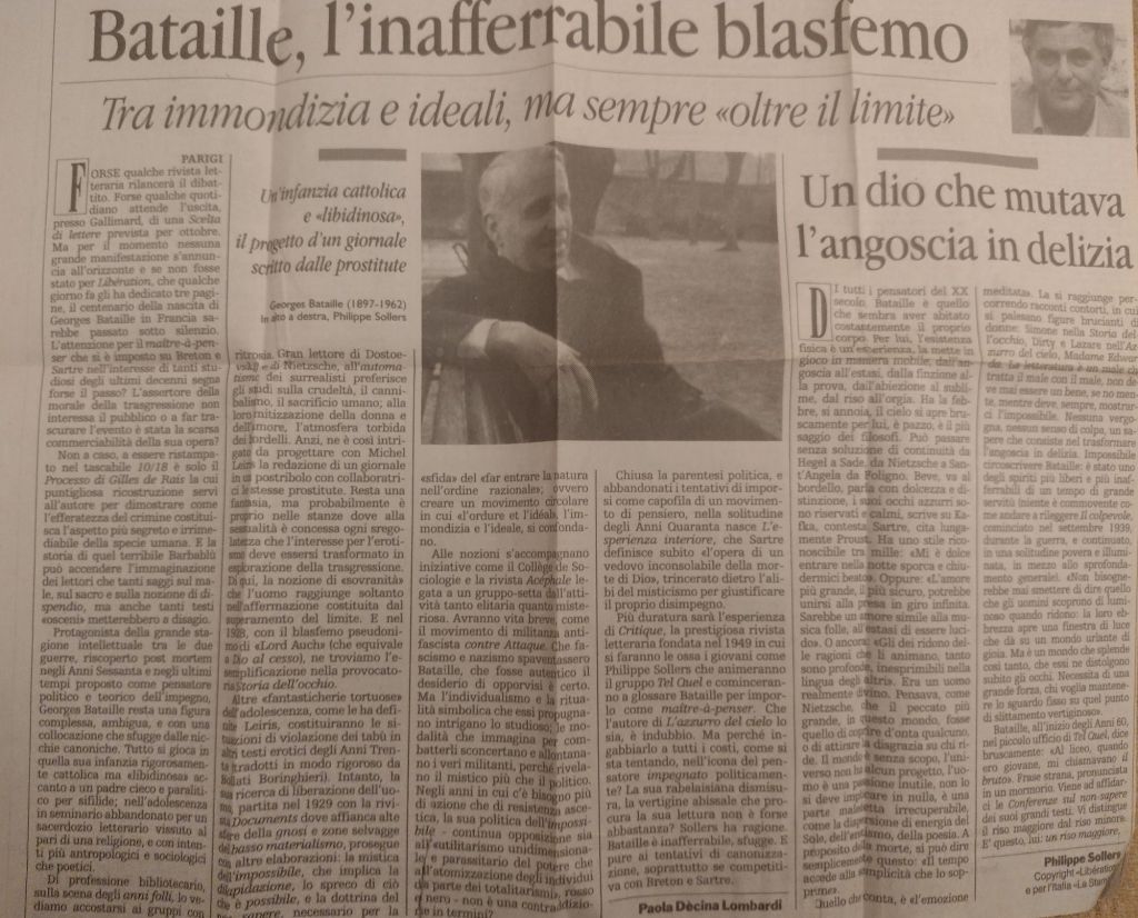 Conservo come una specie di reliquia l’articolo che ha fatto scattare in me la curiosità per Georges Bataille. È stata la prima volta in cui ne ho sentito parlare. Era in effetti un articolo accattivante che dava l’idea del personaggio. Anche se denunciava un disinteresse in Francia per Bataille.